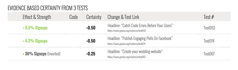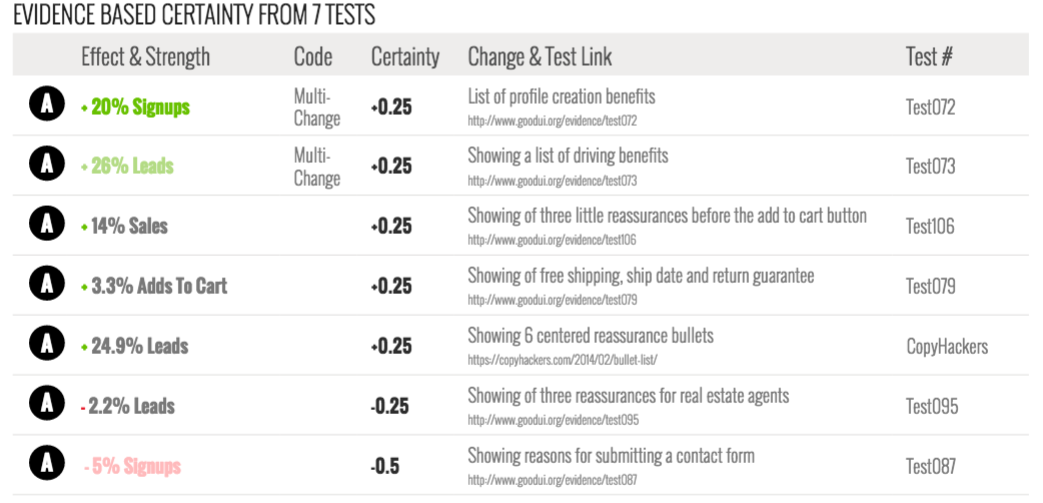 There are numerous studies that have found that selling benefits increases conversions. We were particularly impressed with the research GoodUI.org has done. In the below table, they summarized several tests that proved the usefulness of benefits: