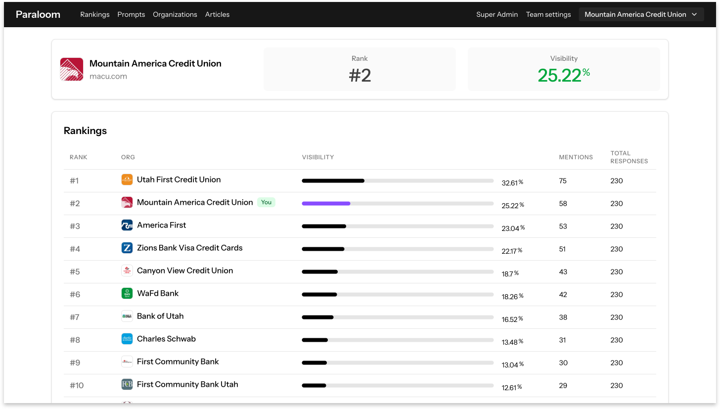 Track how often AI mentions your brand—then go beyond just tracking: Paraloom AI analyzes why competitors are showing up where you're not, helps you generate content that will increase your visibility, and tells you where to publish it.
